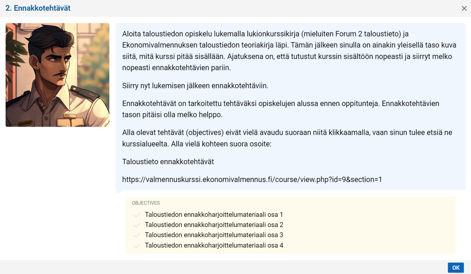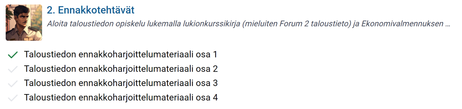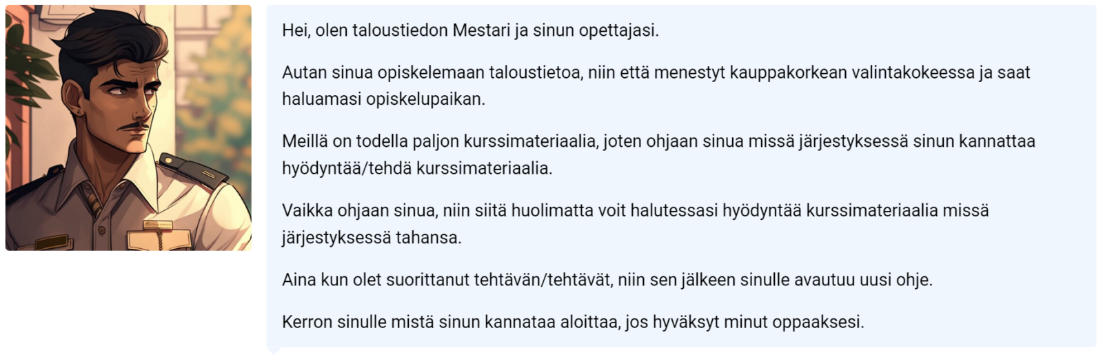 Kun aloitat opiskelun, saat virtuaaliopettajalta tehtävän, joka ohjaa sinut opiskelun alkuun.