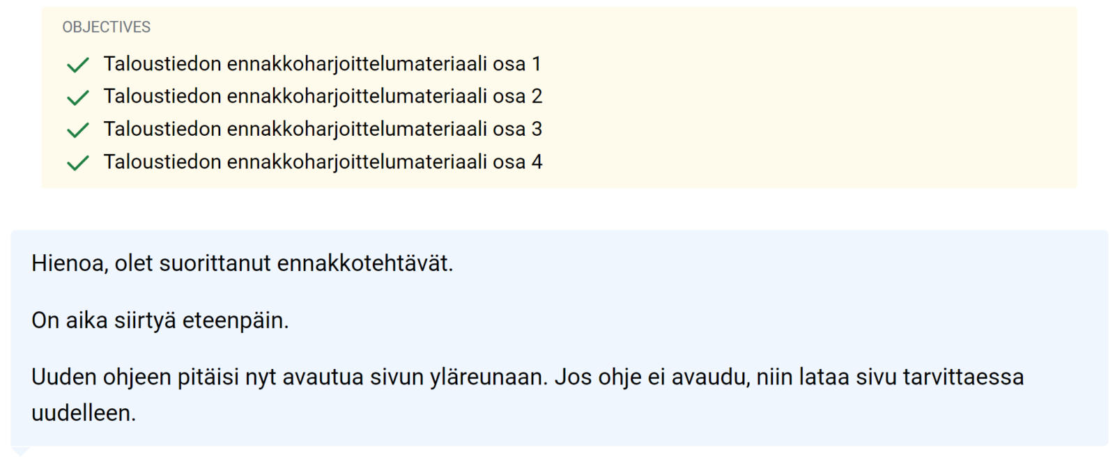 Kun opiskelet, saat jokaisesta suoritetusta tavoitteesta vihreän merkinnän ja voit seurata etenemistäsi kurssin sivulla.